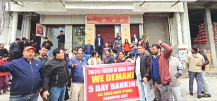 देहरादून/रुद्रपुर। देशभर में बैंक कर्मचारियों की एक दिवसीय राष्ट्रव्यापी हड़ताल का असर मंगलवार को उत्तराखंड में भी व्यापक रूप से देखने को मिला। सरकारी बैंकों के बंद रहने से व्यापारियों, नौकरीपेशा लोगों और आम नागरिकों को भारी परेशानियों का सामना करना पड़ा।तीन दिन की छुट्टिðयों के बाद मंगलवार को लगातार चौथे दिन बैंकिंग सेवाएं ठप रहने से लेनदेन पूरी तरह प्रभावित हो गया। हड़ताल का आ“वान यूनाइटेड फोरम ऑफ बैंक यूनियन्स (यूएफबीयू) ने किया है, जो नौ बैंक यूनियनों का संयुक्त मंच है और सरकारी बैंकों के अधिकारियों व कर्मचारियों का प्रतिनिधित्व करता है। यह कदम 23 जनवरी को मुख्य श्रम आयुक्त के साथ हुई बैठक में कोई समाधान न निकलने के बाद उठाया गया। हड़ताल में भारतीय स्टेट बैंक ,पंजाब नेशनल बैंक , बैंक ऑफ बड़ौदा समेत कई बड़े सरकारी बैंक शामिल रहे। रुद्रपुर- जिला मुख्यालय पर भी हड़ताल का व्यापक असर देखा गया। यहां सभी सरकारी बैंक पूरी तरह बंद रहे। इतना ही नहीं, हड़ताल पर गए कर्मचारियों ने शहर में संचालित कुछ निजी बैंकों की शाखाओं पर पहुंचकर प्रदर्शन किया और वहां भी कामकाज प्रभावित कराते हुए बैंक बंद करा दिए। इसके चलते पूरे शहर में बैंकिंग गतिविधियां पूरी तरह ठप हो गईं। हड़ताल के कारण नकद जमा व निकासी, चेक क्लियरेंस, ड्राफ्ट, पासबुक अपडेट और अन्य रोजमर्रा के बैंकिंग कार्य बाधित रहे। बैंक शाखाओं के बाहर ग्राहकों की भीड़ दिखाई दी, जहां लोग निराश होकर लौटते नजर आए। कई व्यापारियों ने बताया कि भुगतान अटकने से कारोबार पर प्रतिकूल असर पड़ा है, वहीं बुजुर्ग और पेंशनधारक सबसे अधिक परेशान दिखे। हालांकि एचडीएफसी बैंक, आईसीआईसीआई बैंक और एक्सिस बैंक जैसे निजी बैंक सामान्य रूप से काम कर रहे थे, लेकिन कुछ स्थानों पर सरकारी बैंक कर्मियों के प्रदर्शन के चलते वहां भी कामकाज बंद करा दिया। बैंक यूनियनों की मुख्य मांग है कि सप्ताह में पांच कार्यदिवस लागू किए जाएं, यानी सोमवार से शुक्रवार तक बैंक खुले रहें और शनिवार व रविवार को अवकाश घोषित किया जाए। यह प्रस्ताव मार्च 2024 में हुए 12वें द्विपक्षीय समझौते में शामिल किया गया था, लेकिन अब तक केंद्र सरकार की ओर से इसकी आधिकारिक अधिसूचना जारी नहीं की गई है। इसी मांग को लेकर कर्मचारियों ने आज बैंकों को बंद रखा। रुद्रपुर में प्रदर्शन और बैंक बंद कराने में मुख्य रूप से ज्ञान चंद, बंटी राजौरिया, कौशल कुमार,अजीत कुमार, आरके छाबड़ा, गिरीश जोशी,सुरेश शर्मा, स्वरूप कुमार, समीर कुमार राय, शंकर चक्रवर्ती,हिमांशु जोशी आदि बैंक कर्मचारी शामिल थे।