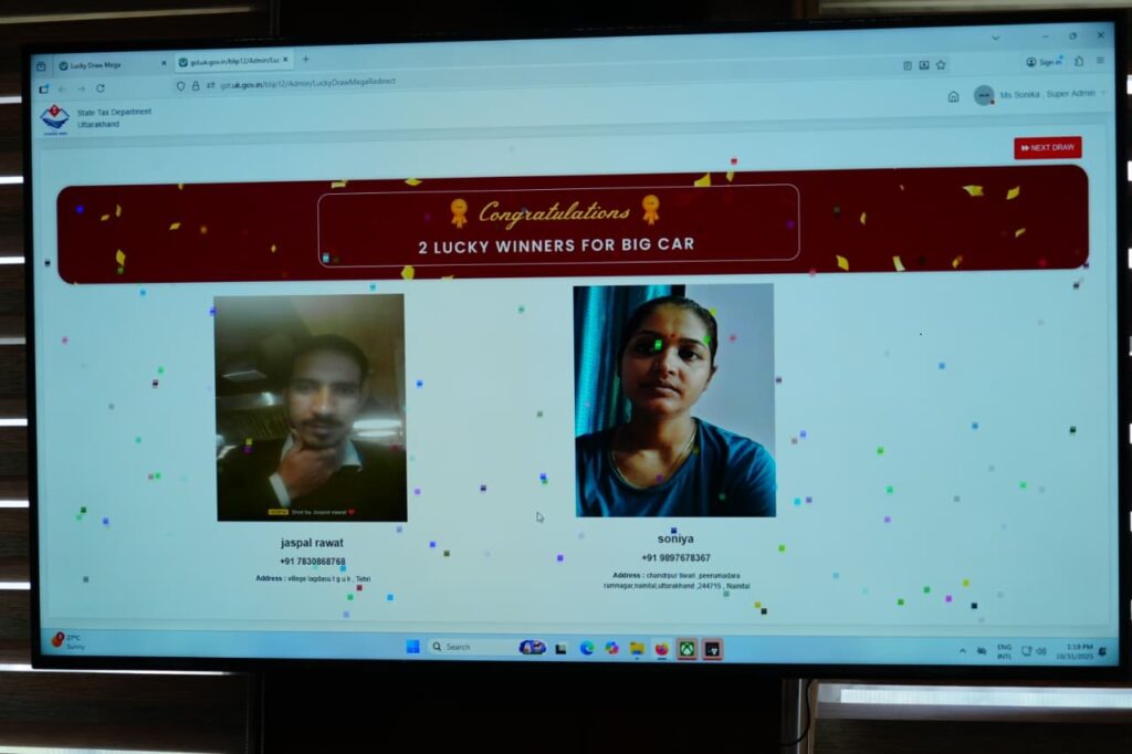 देहरादून। मुख्यमंत्री पुष्कर सिंह धामी ने राज्य स्थापना रजत जयंती समारोह का शुभारंभ करते हुए शुक्रवार को सचिवालय में ‘बिल लाओ, ईनाम पाओ’ के अंतर्गत मेगा लकी ड्रॉ निकाला। राज्य कर विभाग, उत्तराखंड द्वारा आयोजित इस कार्यक्रम में कुल 1888 लकी ड्रॉ विजेता चुने गए। नैनीताल जनपद की सोनिया और टिहरी जनपद के जसपाल रावत ने प्रथम विजेता के रूप में एक-एक इलेक्ट्रिक कार जीती।मुख्यमंत्री ने दोनों विजेताओं से फोन पर बात कर उन्हें शुभकामनाएं भी दीं। मुख्यमंत्री ने कहा कि ‘बिल लाओ, ईनाम पाओ’ योजना राज्य में जारी रहेगी। मुख्यमंत्री पुष्कर सिंह धामी ने कहा कि इस नवाचार ने राज्य के राजस्व संग्रहण को एक नई चेतना और ऊर्जा दी है। वर्ष 2022 में शुरू की गई इस योजना के माध्यम से जनभागीदारी को कर प्रणाली से सीधे जोड़ने का प्रयास किया गया। इस योजना के तहत 6 लाख 50 हजार बिलों के माध्यम से 263 करोड़ रुपये का लेनदेन लोगों द्वारा अपलोड किया गया। इससे व्यापारी वर्ग में कर अनुपालन की संस्कृति को बढ़ावा मिला है और राज्य की राजस्व प्राप्ति में निरंतर वृ( दर्ज हुई है। यह योजना आज एक ओर जहां उपभोक्ता जागरूकता का सशक्त माध्यम बन चुकी है, वहीं साझा जिम्मेदारी का प्रतीक भी बनकर उभरी है।मुख्यमंत्री ने कहा कि इस योजना के माध्यम से व्यवसायियों को भी सहूलियत मिली है। राज्य सरकार व्यापार तंत्र को और अधिक कुशल व पारदर्शी बनाने के लिए सतत प्रयास कर रही है। मुख्यमंत्री ने कहा कि प्रधानमंत्री श्री नरेंद्र मोदी के नेतृत्व में व्यापार, उद्यम और रचनात्मकता को साथ लेकर लोगों में नया विश्वास पैदा किया जा रहा है। भ्रष्टाचार मुक्त व भयमुक्त वातावरण में आज व्यापारी वर्ग पहले की तुलना में अधिक सुरक्षित महसूस कर रहा है।मुख्यमंत्री ने कहा कि प्रधानमंत्री श्री नरेंद्र मोदी के मार्गदर्शन में राज्य में अनेक नवाचार किए जा रहे हैं। फ्ईज ऑफ डूइंग बिजनेसय् और फ्वार्षिक व्यापार सुधार कार्य योजनाय् के माध्यम से राज्य में निवेश और उद्यमिता के लिए अनुकूल वातावरण तैयार किया जा रहा है। राज्य के राजस्व वृ( की दिशा में विशेष ध्यान दिया जा रहा है। राज्य में वित्तीय प्रबंधन में नवाचार, संसाधनों के मितव्ययी उपयोग और नवाचारों के अधिकतम प्रयोग पर बल दिया जा रहा है। इस अवसर पर मुख्यमंत्री ने प्रदेश की जनता से अपील की कि प्रत्येक खरीदारी पर बिल अवश्य मांगें और लेनदेन को पारदर्शी बनाकर राज्य के विकास में सक्रिय भागीदारी निभाएं।मेगा लकी ड्रॉ में 2 विजेताओं ने इलेक्ट्रिक कार, 16 विजेताओं ने कार, 20 विजेताओं ने ई-स्कूटर, 50 विजेताओं ने मोटर साइकिल, 100 विजेताओं ने लैपटॉप, 200 विजेताओं ने स्मार्ट टीवी, 500 विजेताओं ने टैब, तथा 1000 विजेताओं ने माइक्रोवेव एवं अन्य पु