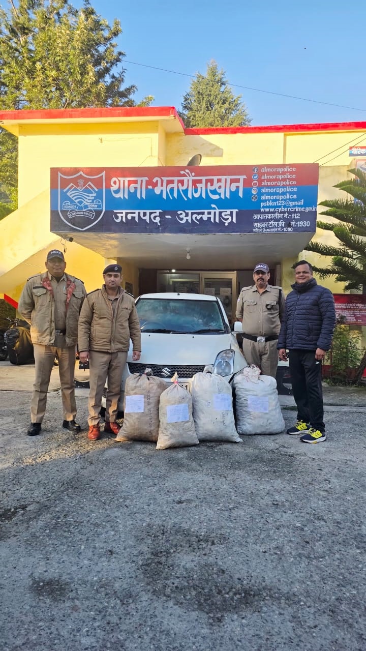 अल्मोड़ा। ड्रग्स फ्री देवभूमि मिशन के तहत पुलिस टीमों की ओर से लगातार नशा तस्करों के खिलाफ सख्त कार्रवाई की जा रही है। भतरौंजखान पुलिस और एसओजी की संयुक्त टीम ने एक कार से 54 किलो गांजा बरामद किया। हालांकि गांजा तस्कर पुलिस को चकमा देकर फरार हो गए।पुलिस टीम ने रामनगर रोड स्थित पीलीकोटी के पास चेकिंग अभियान चलाया। इस दौरान एक स्विफ्ट कार डीएल-5-सीएफ-9911 को रुकने का इशारा किया। लेकिन चालक कार को तेज रफ्रतार से भगा ले गया। शक होने पर पुलिस टीम ने पीछा किया। जिस पर चालक छोटी घठ्ठी तिराहे से करीब 100 मीटर पहले कार को छोड़कर अंधेरे का फायदा उठाकर फरार हो गया। कार की तलाशी लेने पर पुलिस को चार कट्टों में कुल 54.378 किलो गांजा बरामद हुआ है। फरार तस्कर के विरुख थाना भतरौजखान में एनडीपीएस एक्ट के तहत प्राथमिकी दर्ज कर पुलिस तस्कर की तलाश में जुट गई है। यहां पुलिस टीम में चौकी प्रभारी भिकियासैंण संजय जोशी, हेड कांस्टेबल आनंद त्रिपाठी, नारायण सिंह, कांस्टेबल गणेश दत्त शामिल रहे। एसएसपी देवेंद्र पींचा ने कहा कि नशा तस्करों के विरुख जिलेभर में संघन अभियान जारी रहेगा और किसी भी कीमत पर नशे के कारोबार को पनपने नहीं दिया जाएगा।